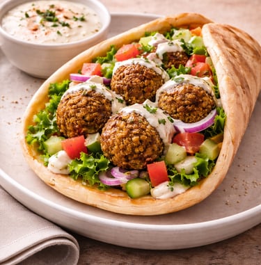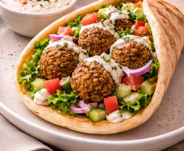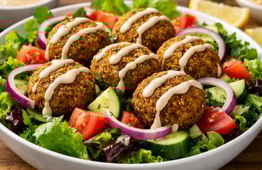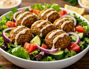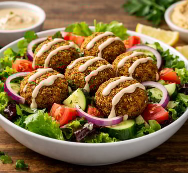 Crispy, golden falafel made from finely ground Fava Beans, fresh herbs, garlic, and aromatic spices, served, vibrant greens. Accompanied by ripe tomatoes, cucumbers, red onions, and drizzled with creamy tahini sauce for a light, flavorful, and satisfying meal.