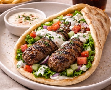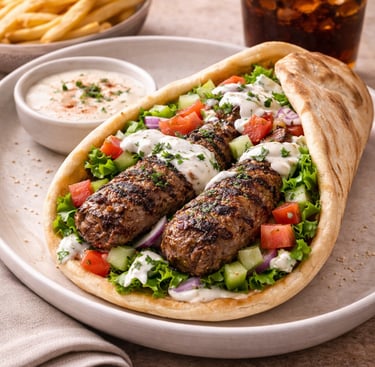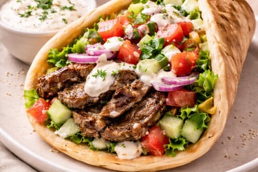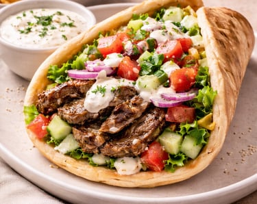 Authentic gyro-style lamb served in warm pita bread, layered with shredded lettuce, traditional Egyptian Salata, and crumbled feta cheese. Finished with a drizzle of creamy tzatziki sauce for a flavorful, satisfying bite.