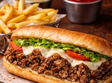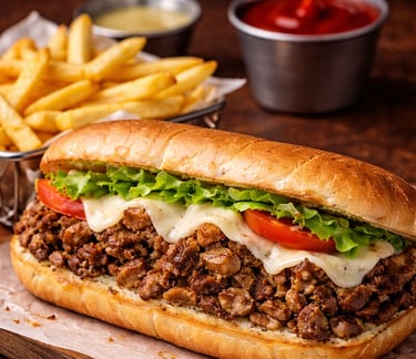 Thinly sliced, grilled chicken or premium steak, layered with melted provolone cheese, crisp lettuce, fresh tomato, and creamy mayonnaise, all served warm on a toasted 8-inch sub roll and French Fries.