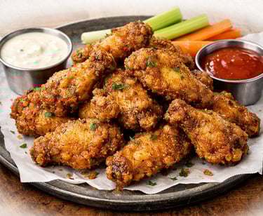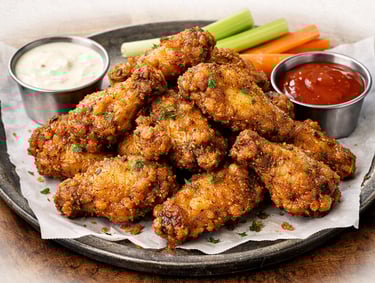 Authentic Buttermilk-Marinated Fresh chicken wings marinated in creamy buttermilk and a signature blend of spices, lightly coated in seasoned flour and perfectly fried to a golden crisp. Served hot and flavorful with your choice of house-made sauce.
