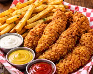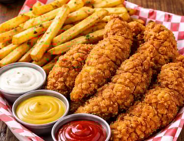 Fresh chicken strips soaked in buttermilk, seasoned just right, and fried to golden perfection. Served hot with your choice of dipping sauce and French Fries