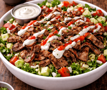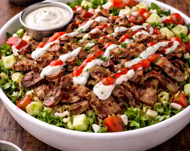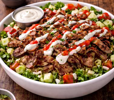 Authentic gyro-style lamb, served over Egyptian a fresh salad, topped with shredded lettuce, traditional Egyptian Salata, and crumbled feta cheese. Finished with a drizzle of creamy tzatziki sauce and a touch of hot sauce for the perfect balance of flavors.