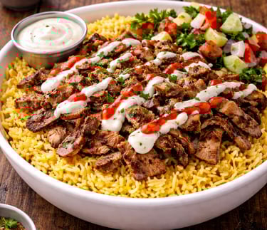 Authentic gyro-style lamb, served over fragrant Egyptian long-grain rice and a fresh salad, topped with shredded lettuce, traditional Egyptian Salata, and crumbled feta cheese. Finished with a drizzle of creamy tzatziki sauce and a touch of hot sauce for the perfect balance of flavors.