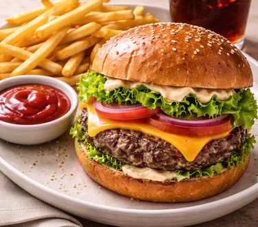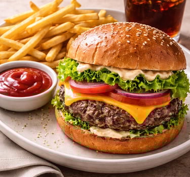 Authentic beef burger made from seasoned ground beef, served on a fresh bun with tahini sauce, ripe tomato, crisp red onion, lettuce, and creamy mayonnaise. Accompanied by golden French fries and a refreshing soda for a complete, satisfying meal.
