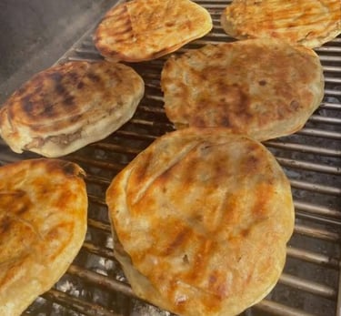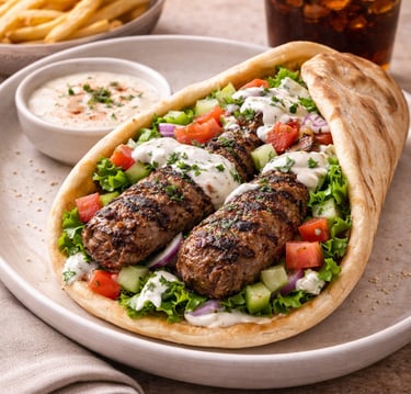 Authentic Egyptian Beef Hawawshi featuring seasoned ground beef blended with Chef Youssef’s signature spice mix, baked to perfection in soft pita bread. Served with creamy tahini sauce, traditional Egyptian slaw, crispy French fries, and a refreshing soda